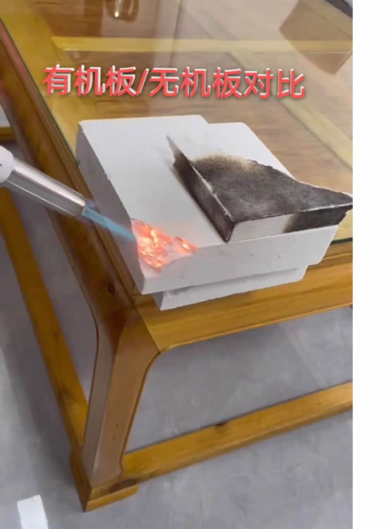 ①傳統(tǒng)有機(jī)纖維板,有機(jī)物含量7-12%,容易吸潮霉變,高溫下有機(jī)物著火冒煙。